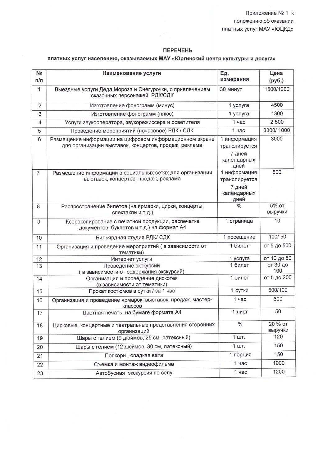 Перечень платных услуг населению, оказываемых МАУ "Юргинский центр культуры и досуга"